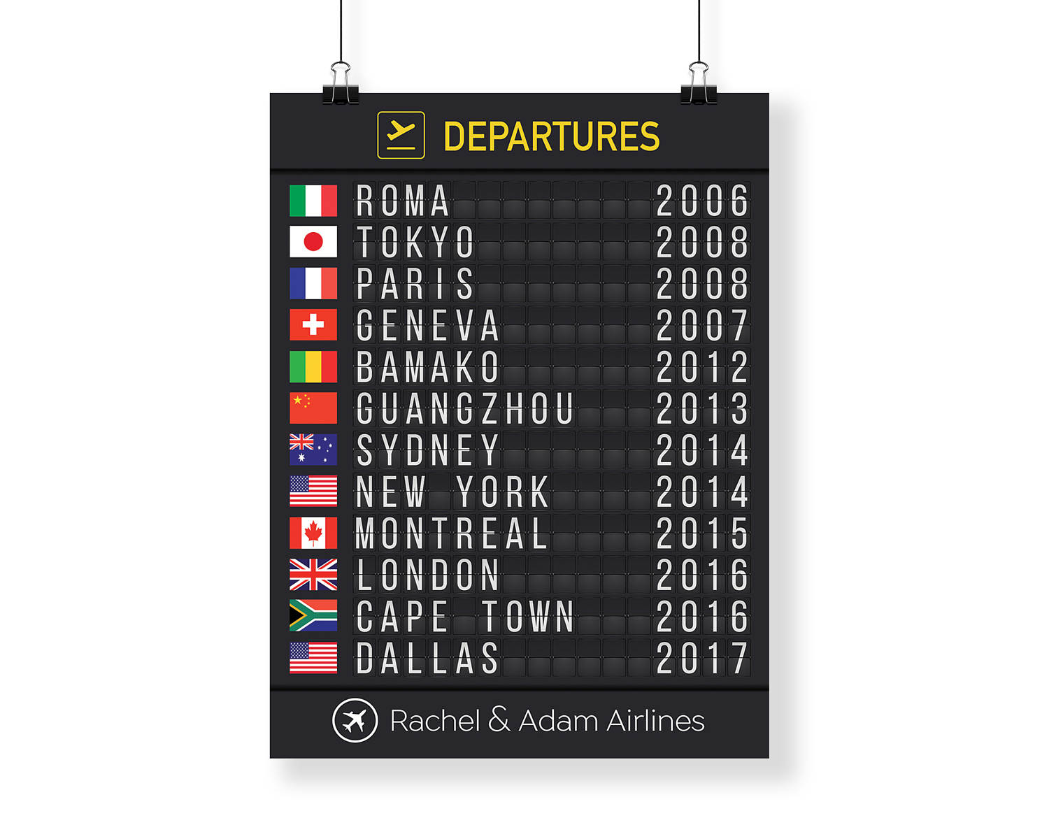 This print has 12 lines with each 12 customizable characters + 4 digits . It can be customized with whatever your choice is. It can be destinations, countries, or any words you would like to see. You can also modify the bottom section message. I will add the country flag on the left of the row.