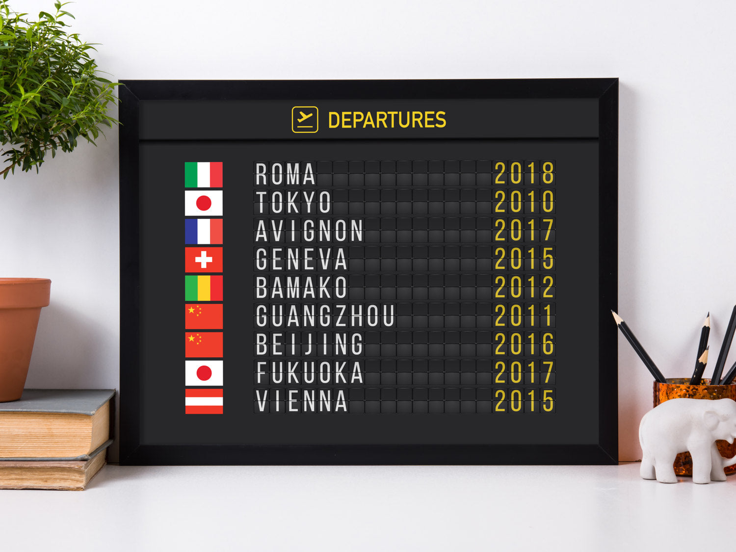 This poster your stylized personalized airport board with country flags added. It is great way to remember past adventures and dream on new ones!