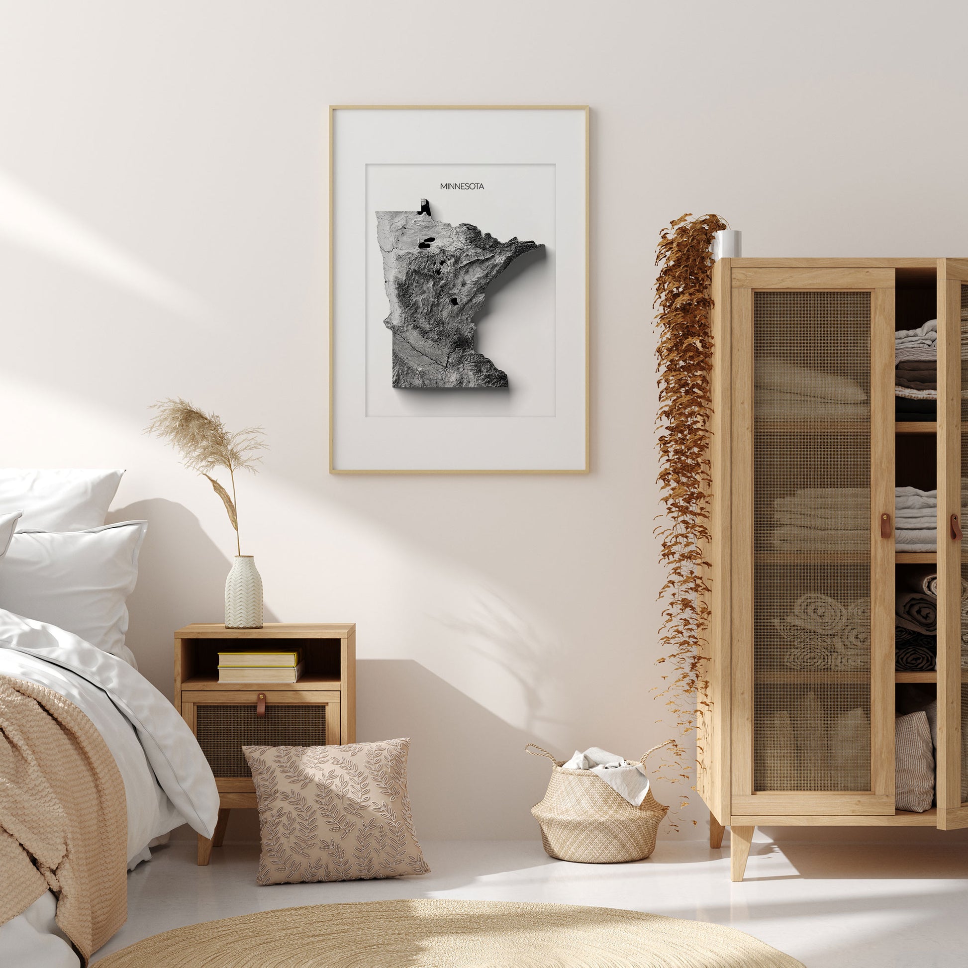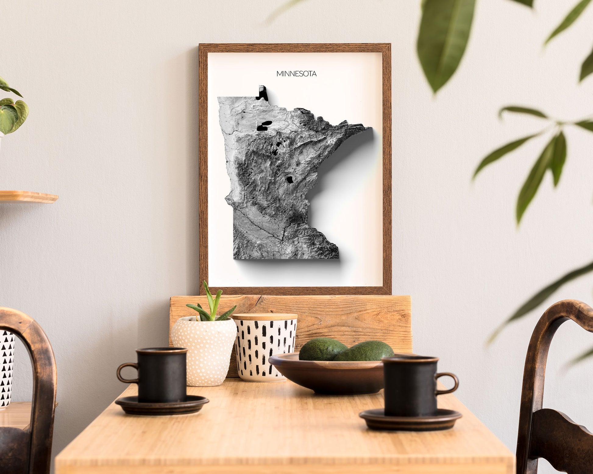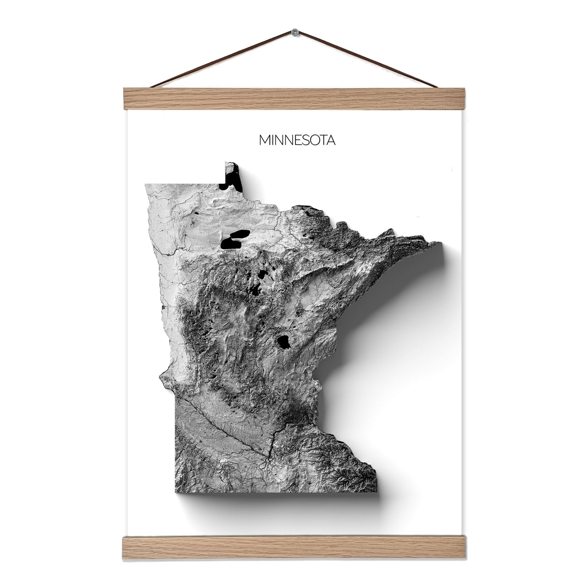 Here is a map of Minnesota with topographic rendering which is printed in 2D but gives a third dimension effect (it is not a raised relief map though, it is completely flat). It is made from exact altitude measurements and made to look stunning! It has the most details you can find , down to roads and cities. A magnifying glass might be needed to see them all!